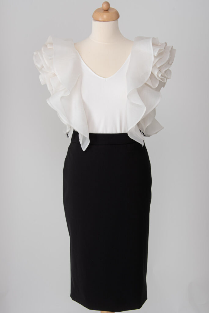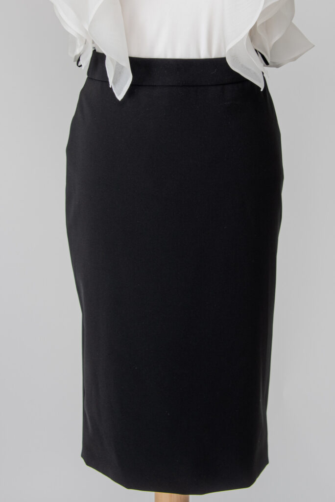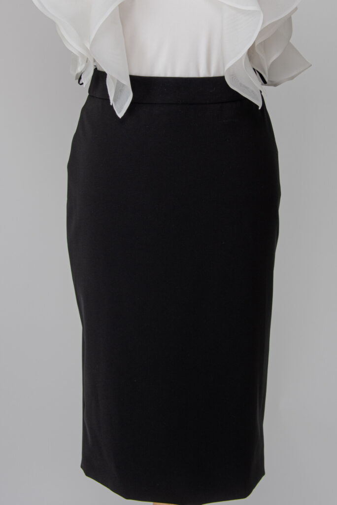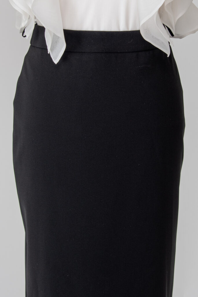 The skirt is made by hand pleating, the folds widen slightly from the waistline to the bottom. The bottom has a narrow clarification and a hidden peeling seam, with a hidden zipper on the side. The stitching of the waistband is aligned with the delicate material of the skirt in the line of the stitching, thus covering it almost completely. Assembling the short lining with an open seam, the bottom folded back twice and stitched at 0.5 cm.