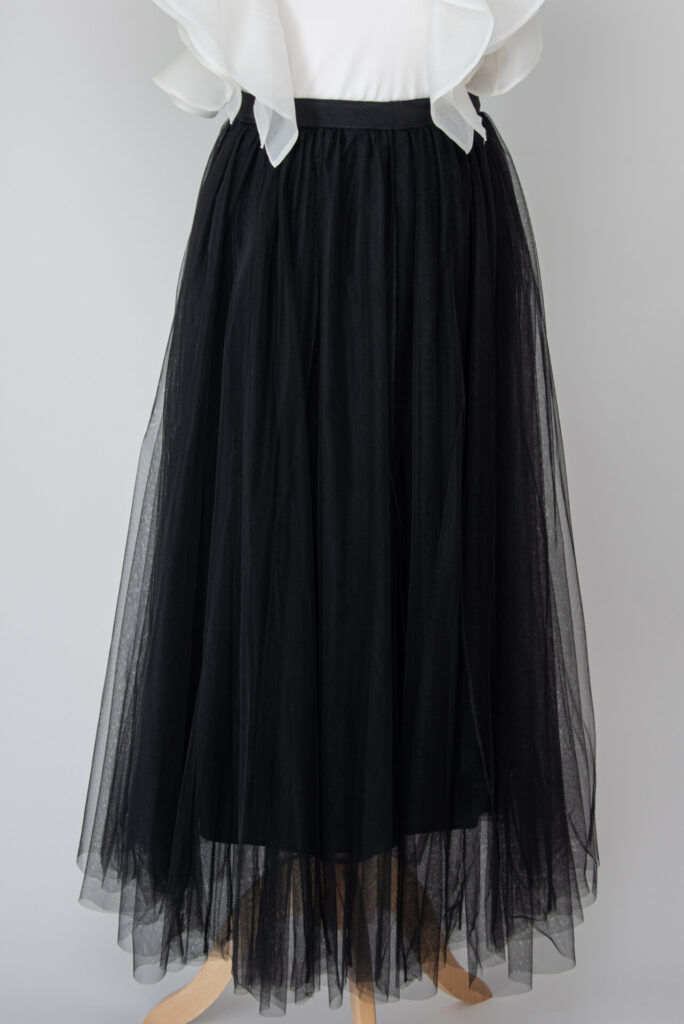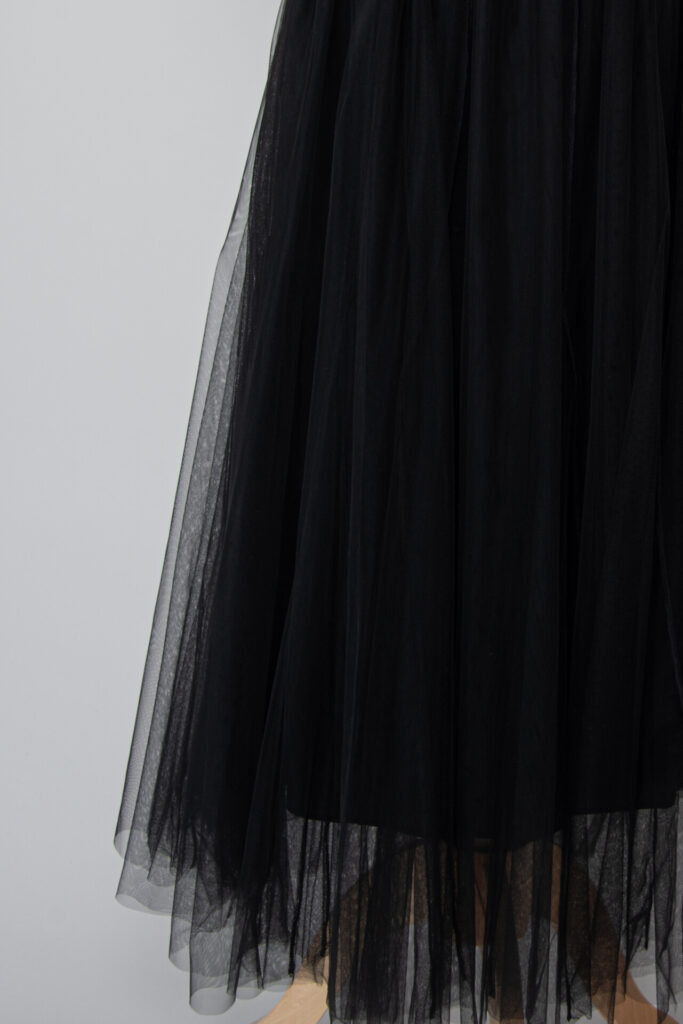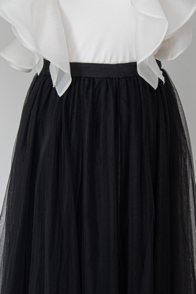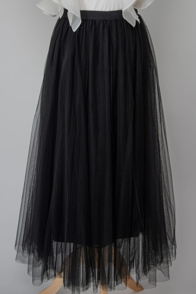 The skirt consists of two layers of tulle and a separate lining. Pleated waistline with a rip waistband, inserts that extend towards the bottom in the cut lines, and a hidden zipper on the left side. Its special feature is that the seams of the inserts are on the color side and are made with a microendlis decorative seam. There is a lot of use of tulle material due to the double layer and special tailoring, which together make the piece elegant and unique.