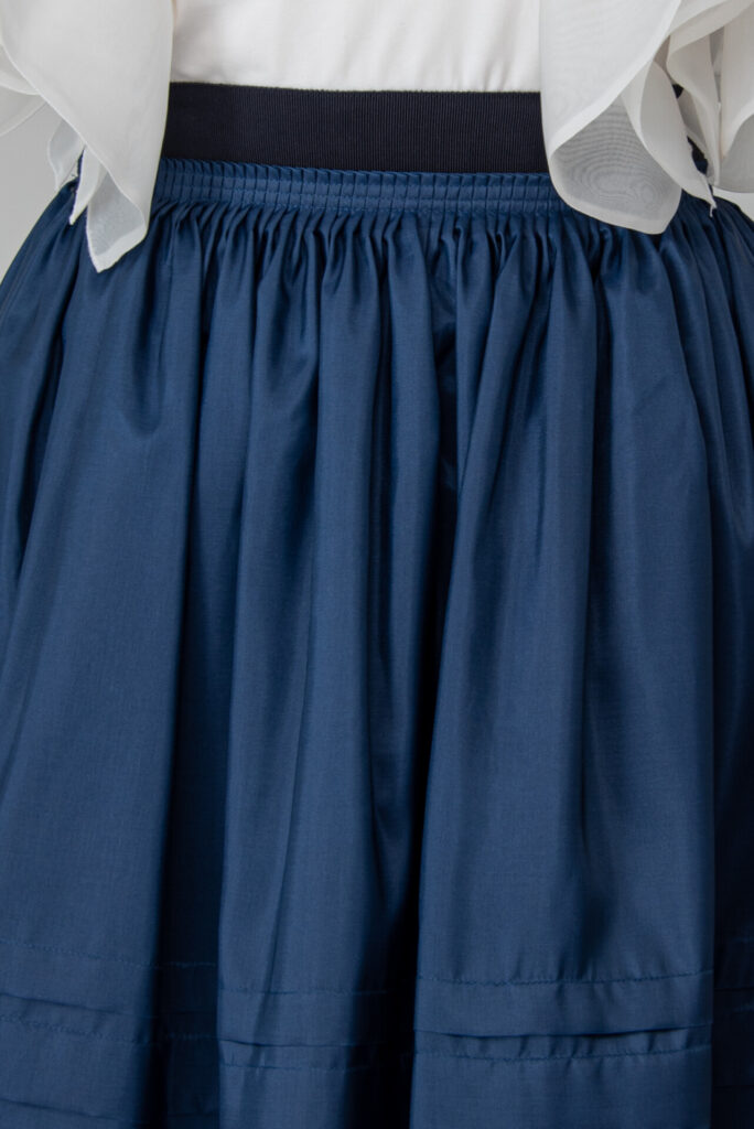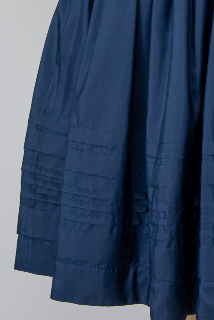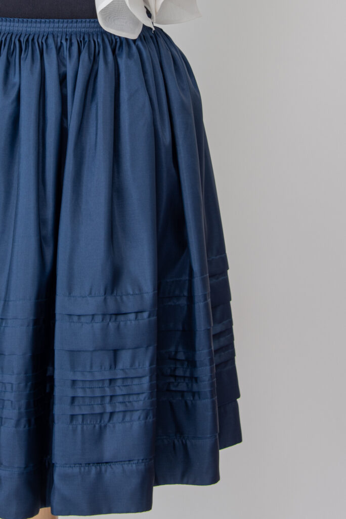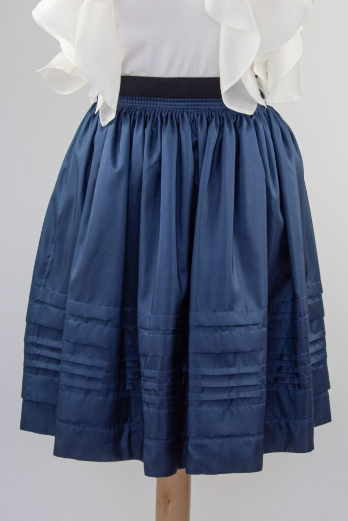 The waist of the skirt is made to size with 4 mm folds and then sewn with 3 rows of stitching. At the bottom of the skirt there are 3 wide and 3 narrower sewn-in folds parallel to the bottom line, which were first ironed and then pinned according to the template, The raw material has a silk effect, a soft fall due to its weight, but at the same time it is good to hold, very comfortable and airy to wear, and it emphasizes the special sewing technology. The inside of the skirt is made with a wide rape tape, which also helps in a great hold. The zipper is hidden on the side, and the waist is made of ribbon outside and inside.