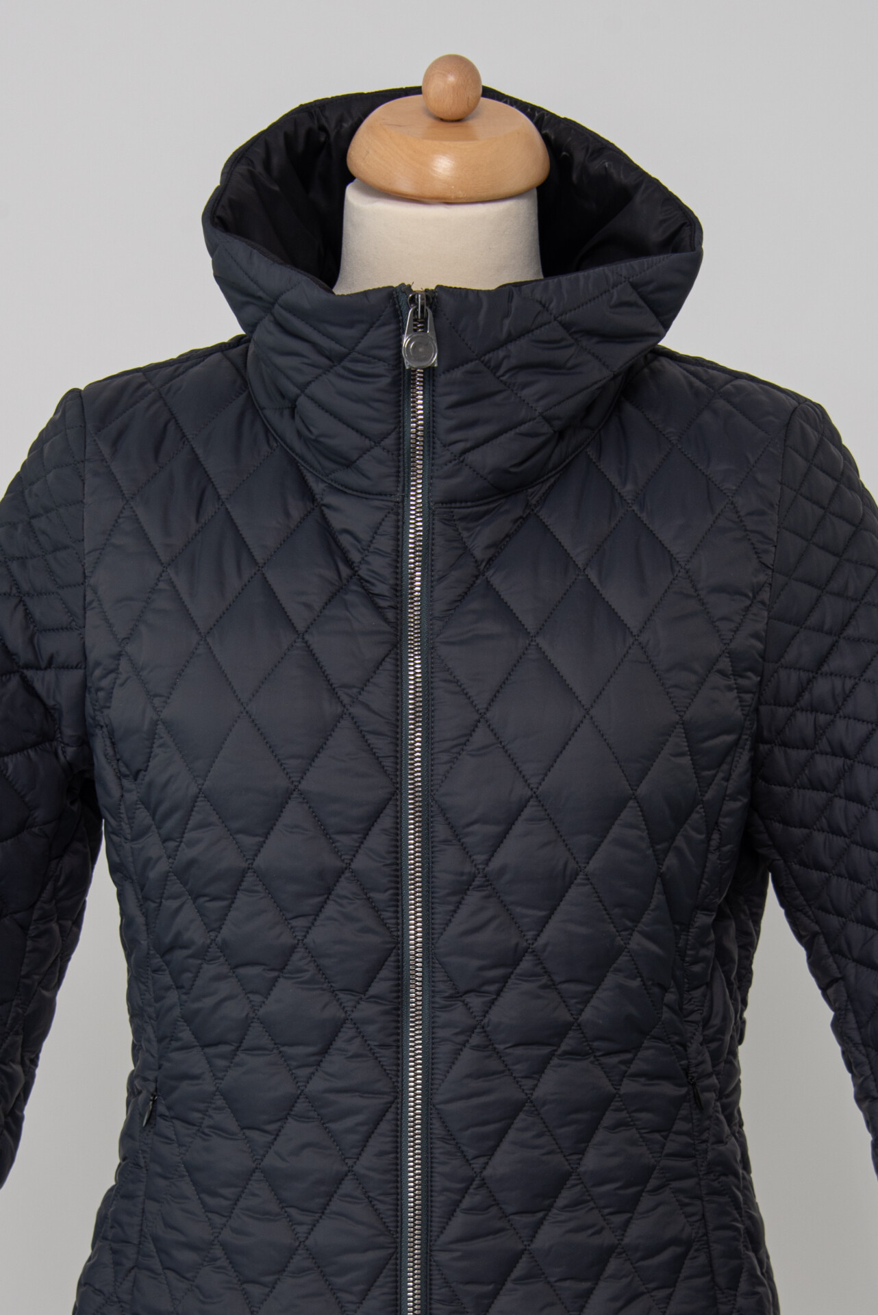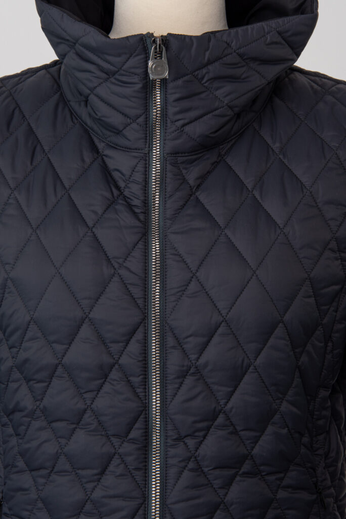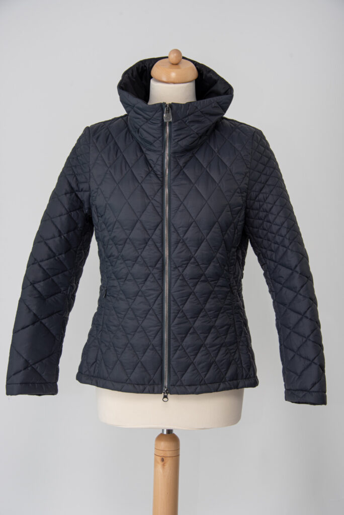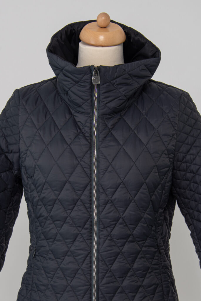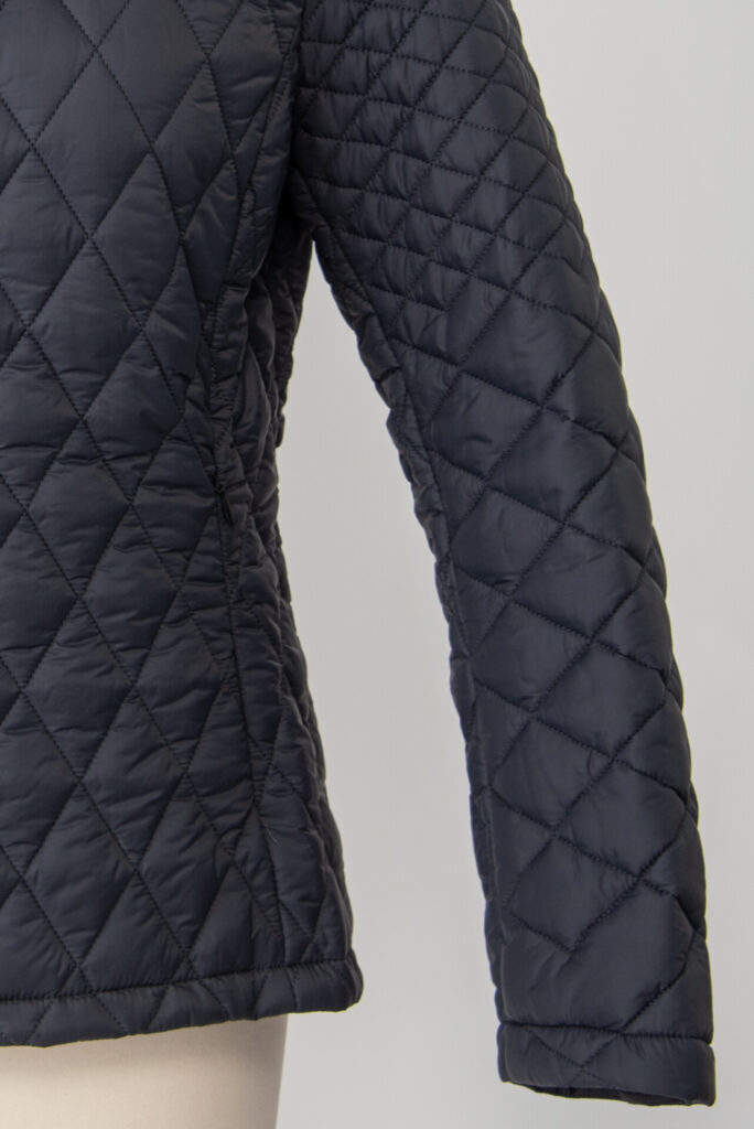 Lined women’s feathered jacket with two-needle quilting. The duck feather filling is filled into feather bags made of a case material, the case material being densely woven with an impregnated coating, preventing the feather flakes from escaping to the outer surface of the material. The jacket is made with side-pocketed pockets with a hidden zipper. The quilting was made in a fantasy form with a two-needle loop sewing machine. The quilting on the raw material was done together with the feather bag. The front closes with a metal zipper, cover strap and press zipper. The jacket is fully lined with a narrow strap at the bottom of the sleeve. The staples were made with Nm 80 stapling thread. The collar is removable on the collar and can also be used with pressure patents.