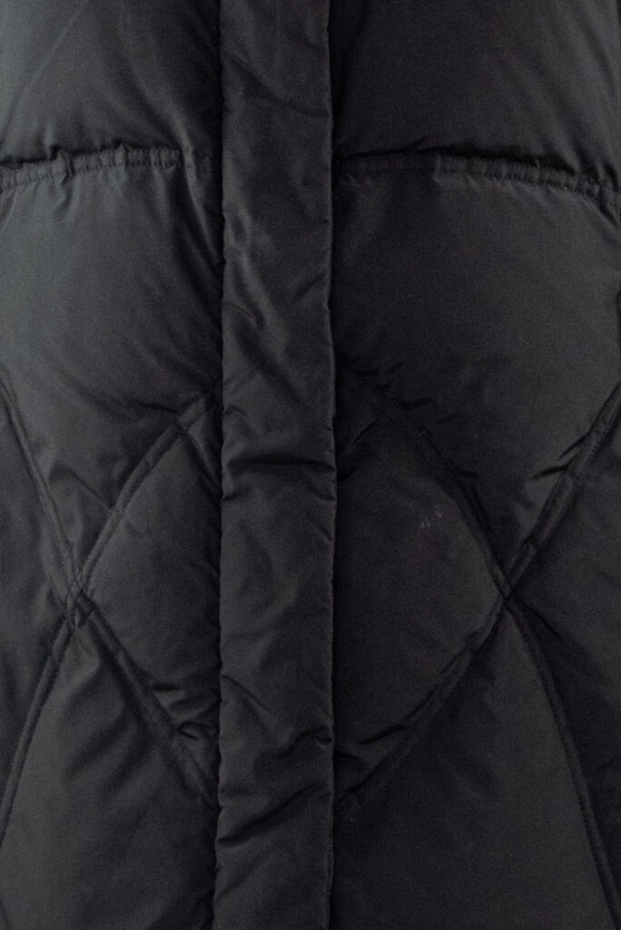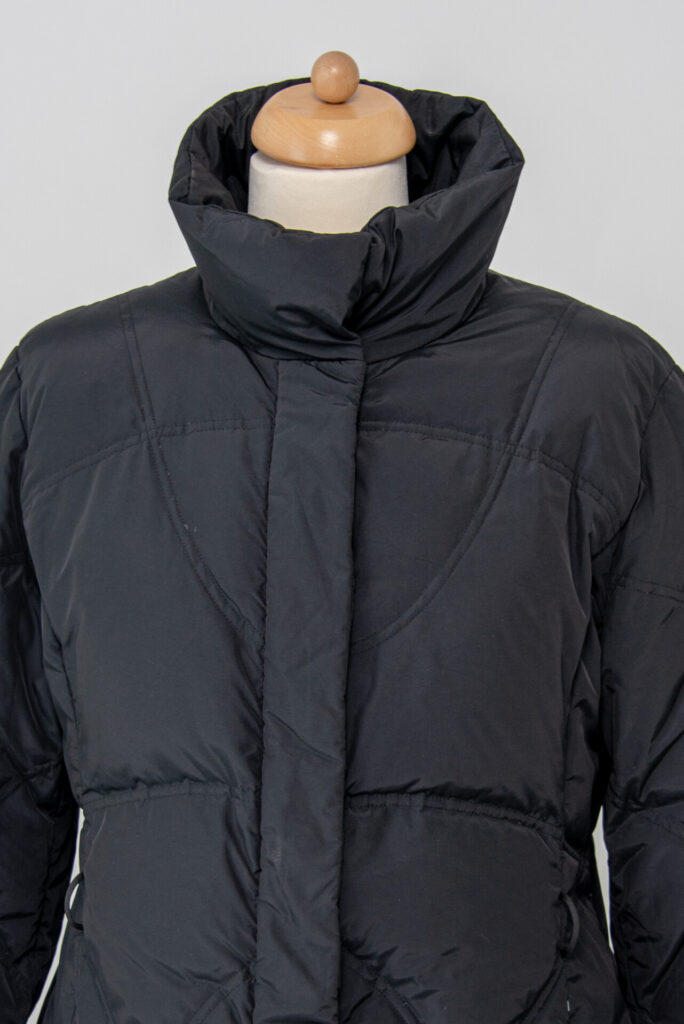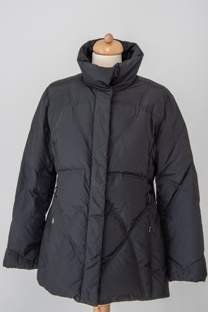 The jacket is made with a standing collar and a cotton batt, the batting is between the base material and the lining material. The different forms of quilting make the single-color base material special. The cut lines accentuate the shape of the body, with pockets in the front cut lines that close with a hidden zipper. The assembling seams were made with a loop-stitched closed seam, which was cleaned with a 3-thread interlock machine and then machined with a slotted appliance, making the inside of the jacket completely clean and covered with seams. Metal zipper at the front with a quilted washer strap, the zipper is sewn on in mm. The staples were made with Nm 80 stapling thread.