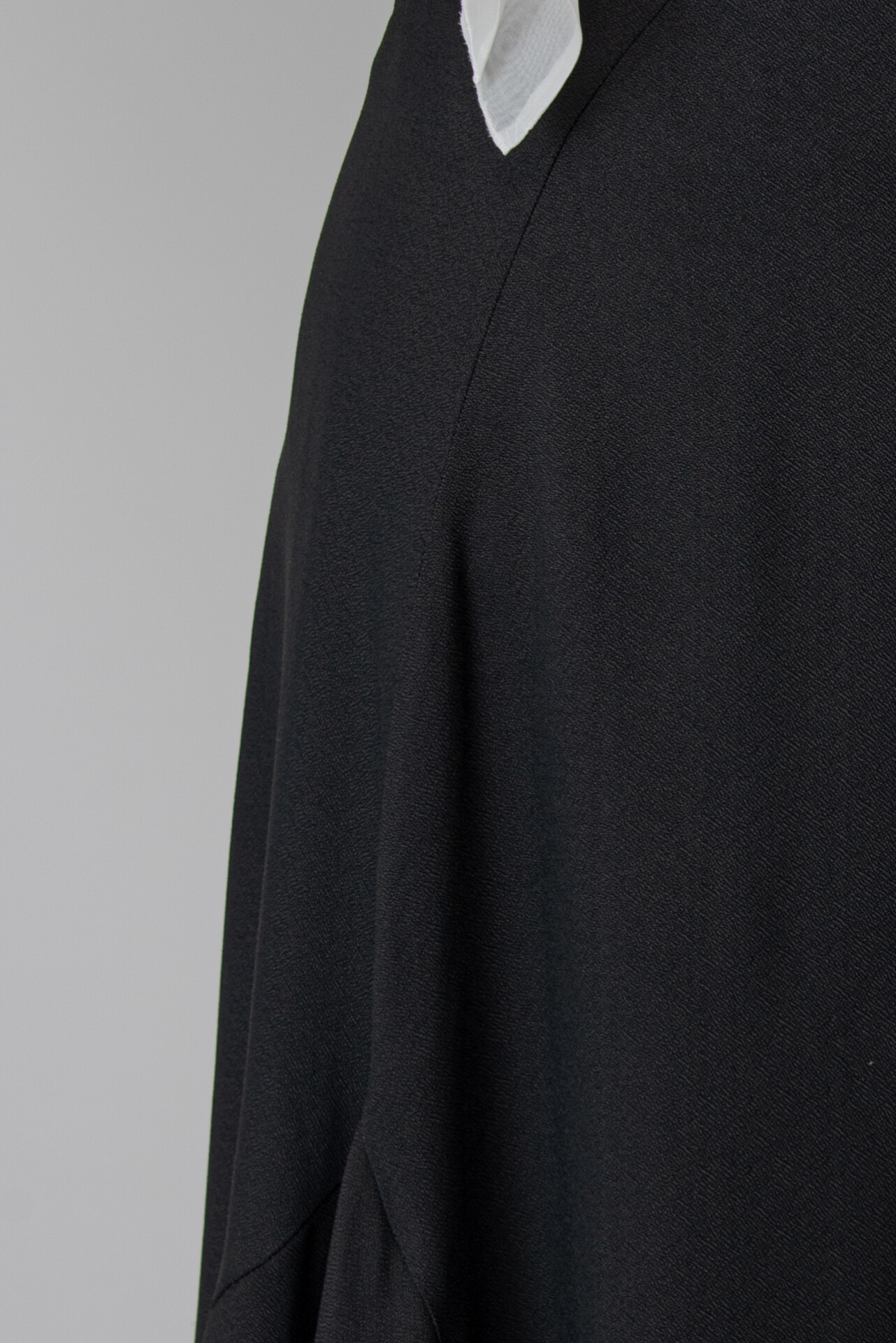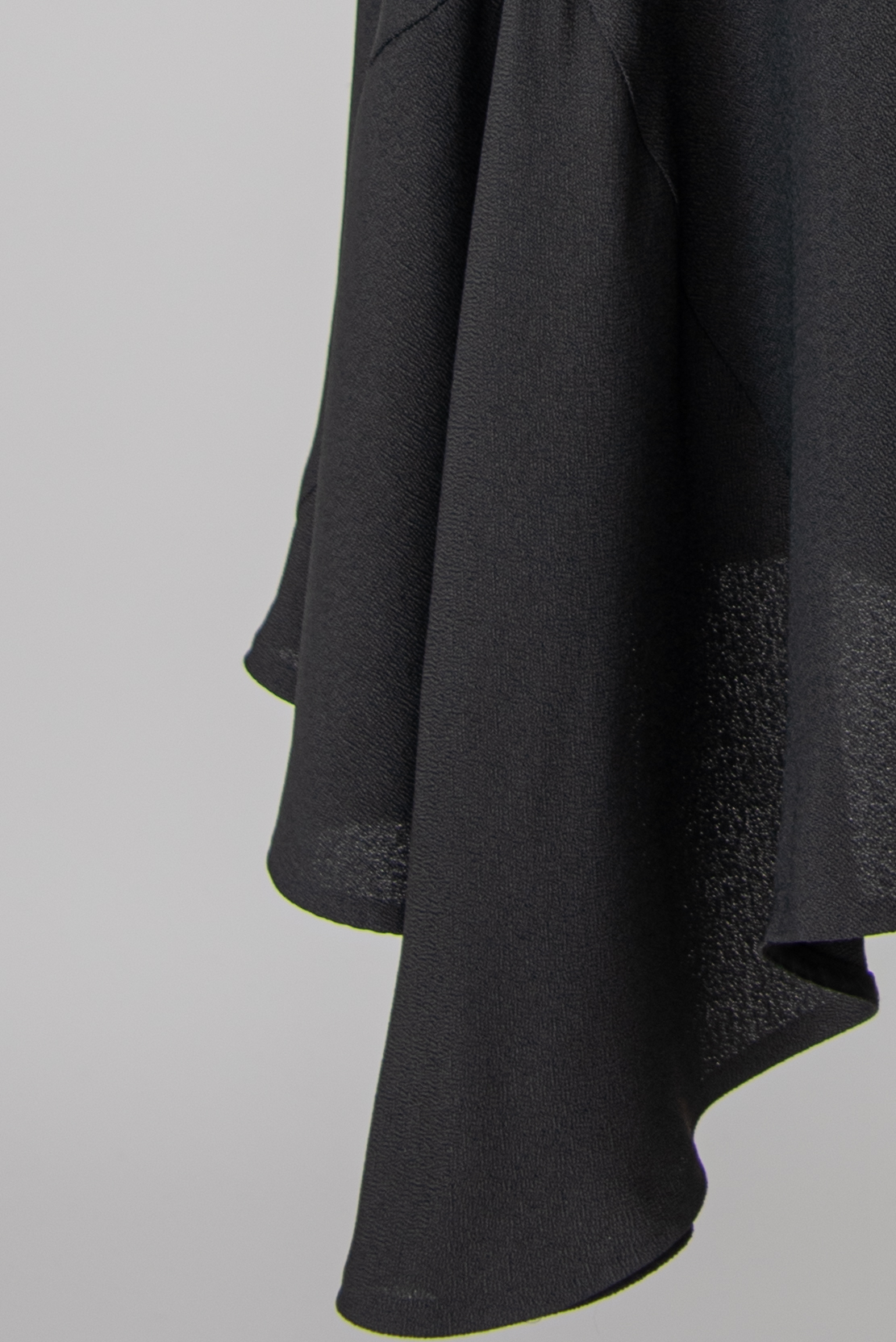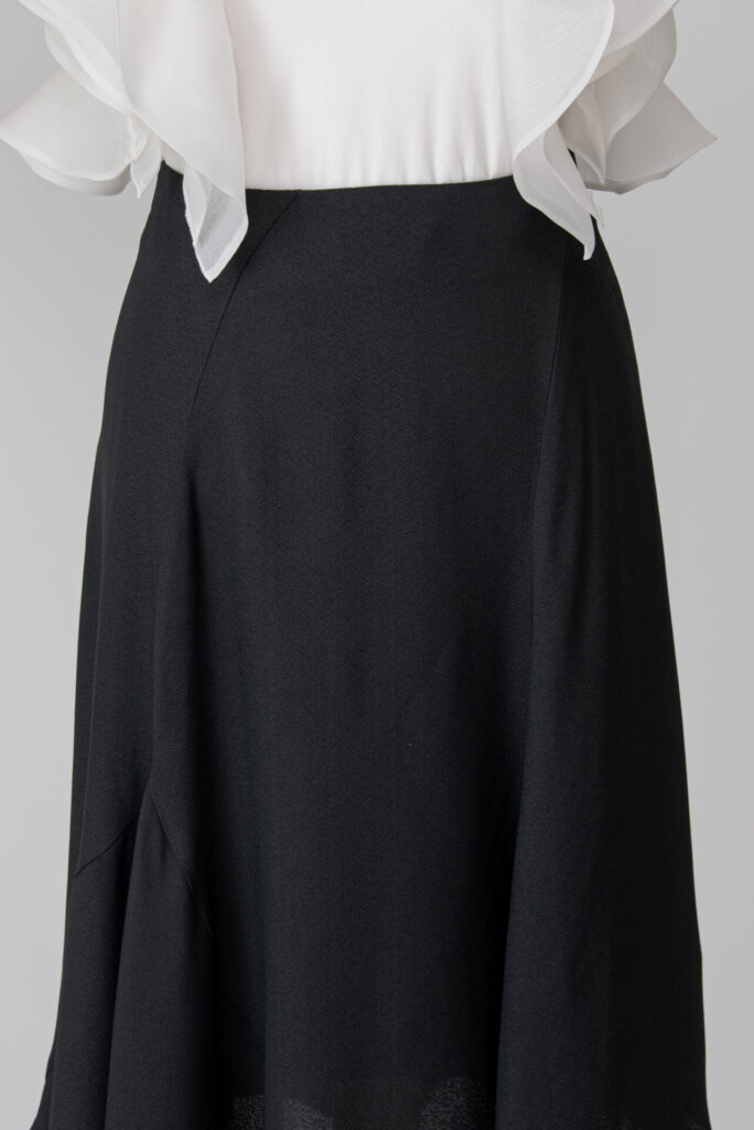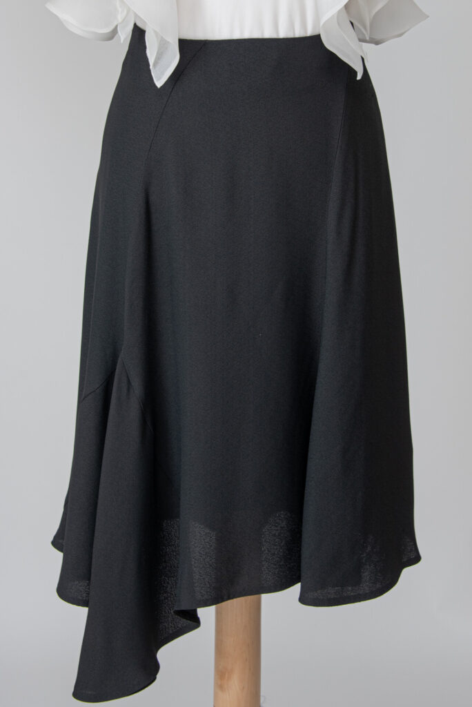 The interesting features of the skirt are the cut lines and the wedge-shaped insert built into the bottom. The soft-falling base material emphasizes the cut lines well, the bottom of the skirt is hemmed with a satin bevel and then folded back with a hidden seam, so that the curved bottom retains its shape. The back closes with a hidden zipper in the middle, a small button and a button.